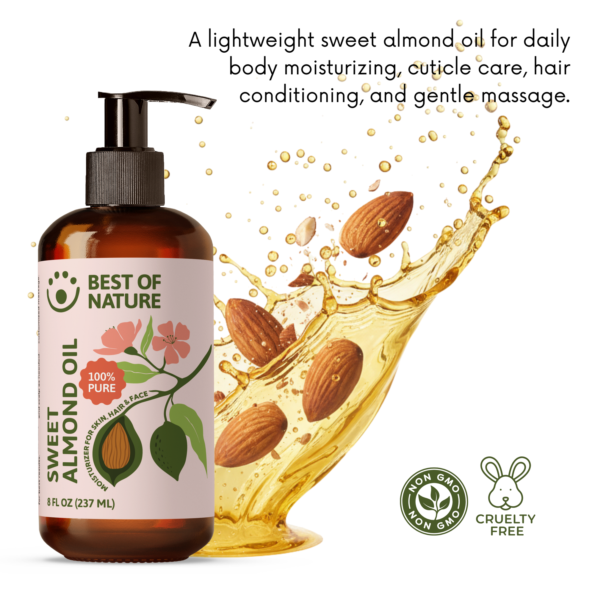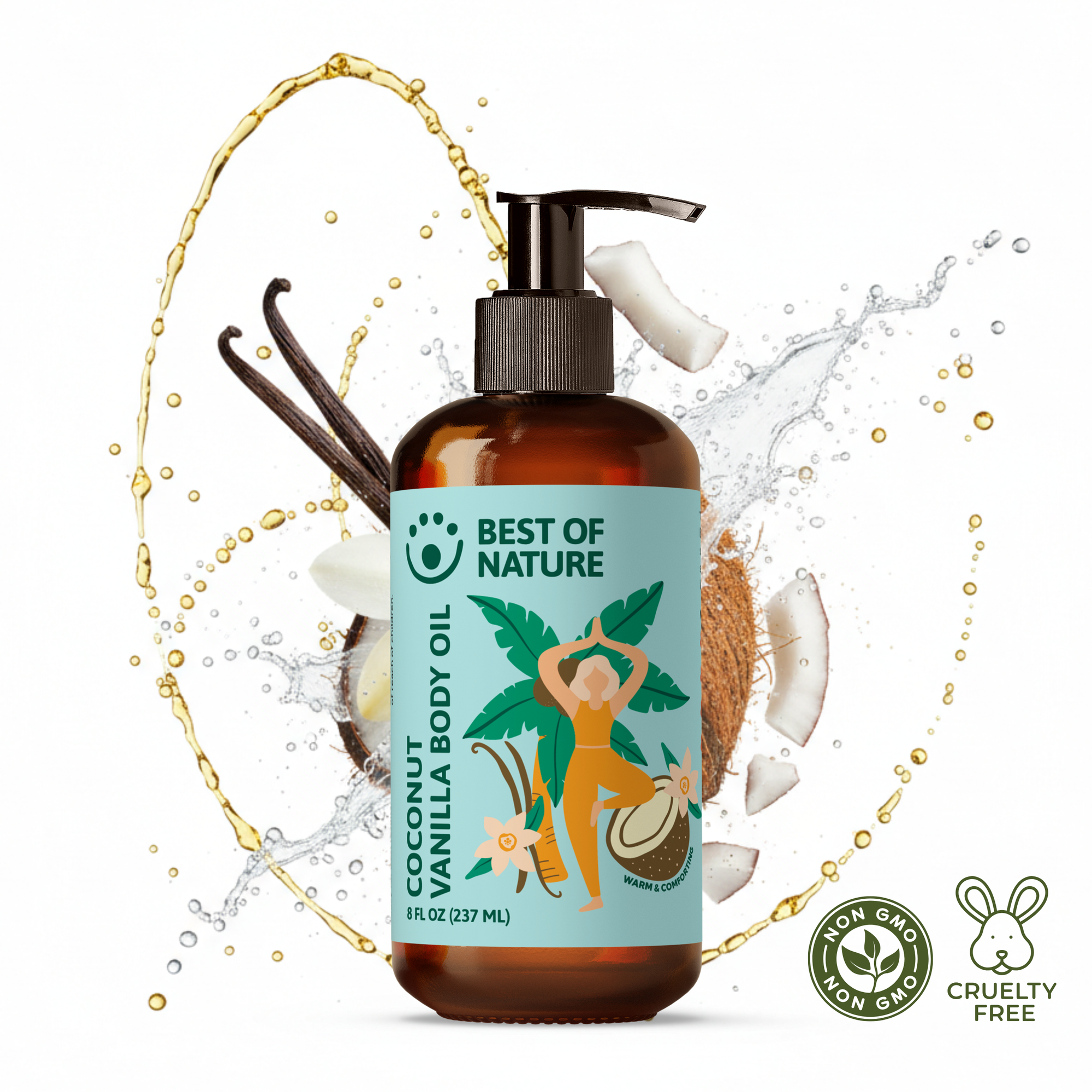 Bottle of Best of Nature Apothecary Vitamin E Oil with a splash of oil on a white background.