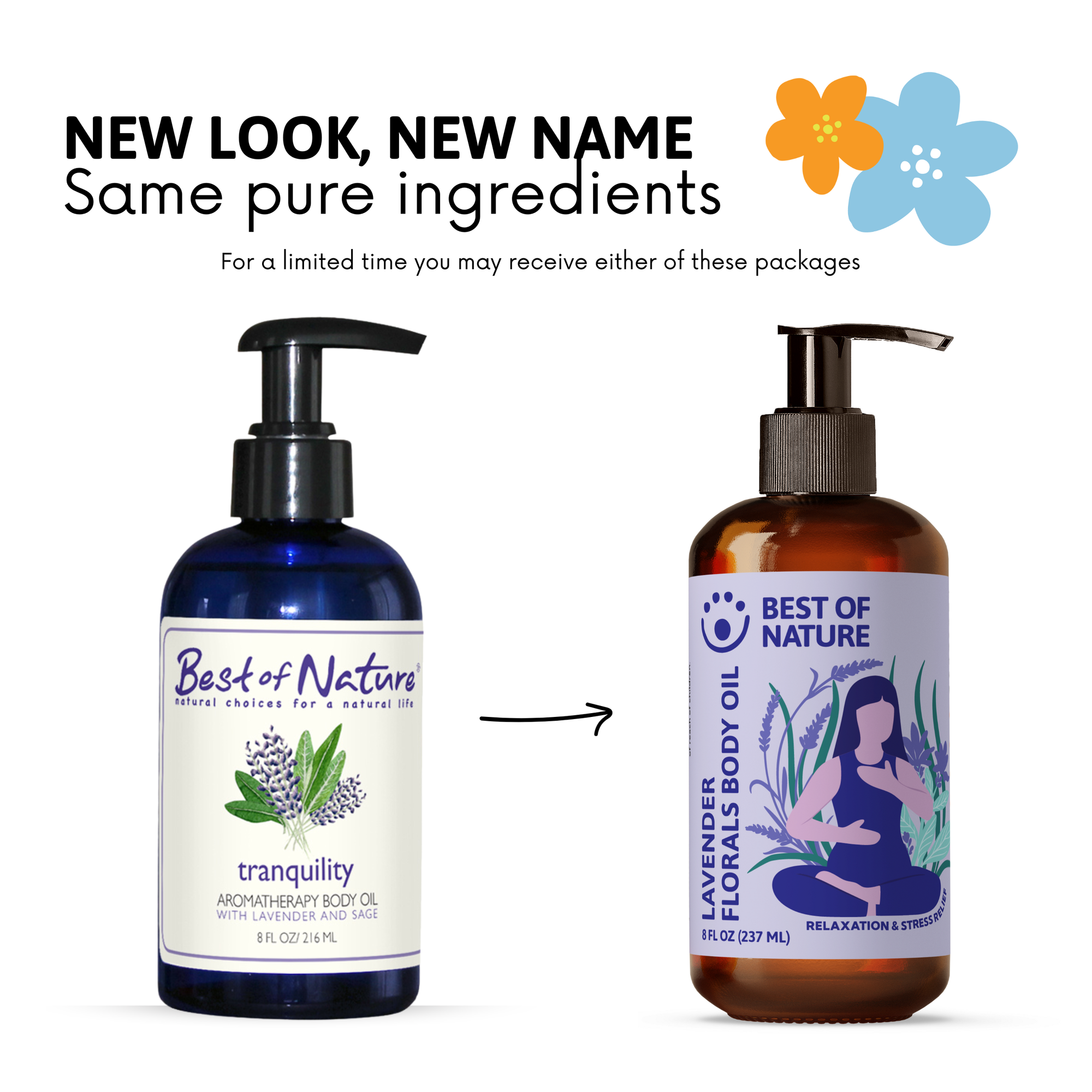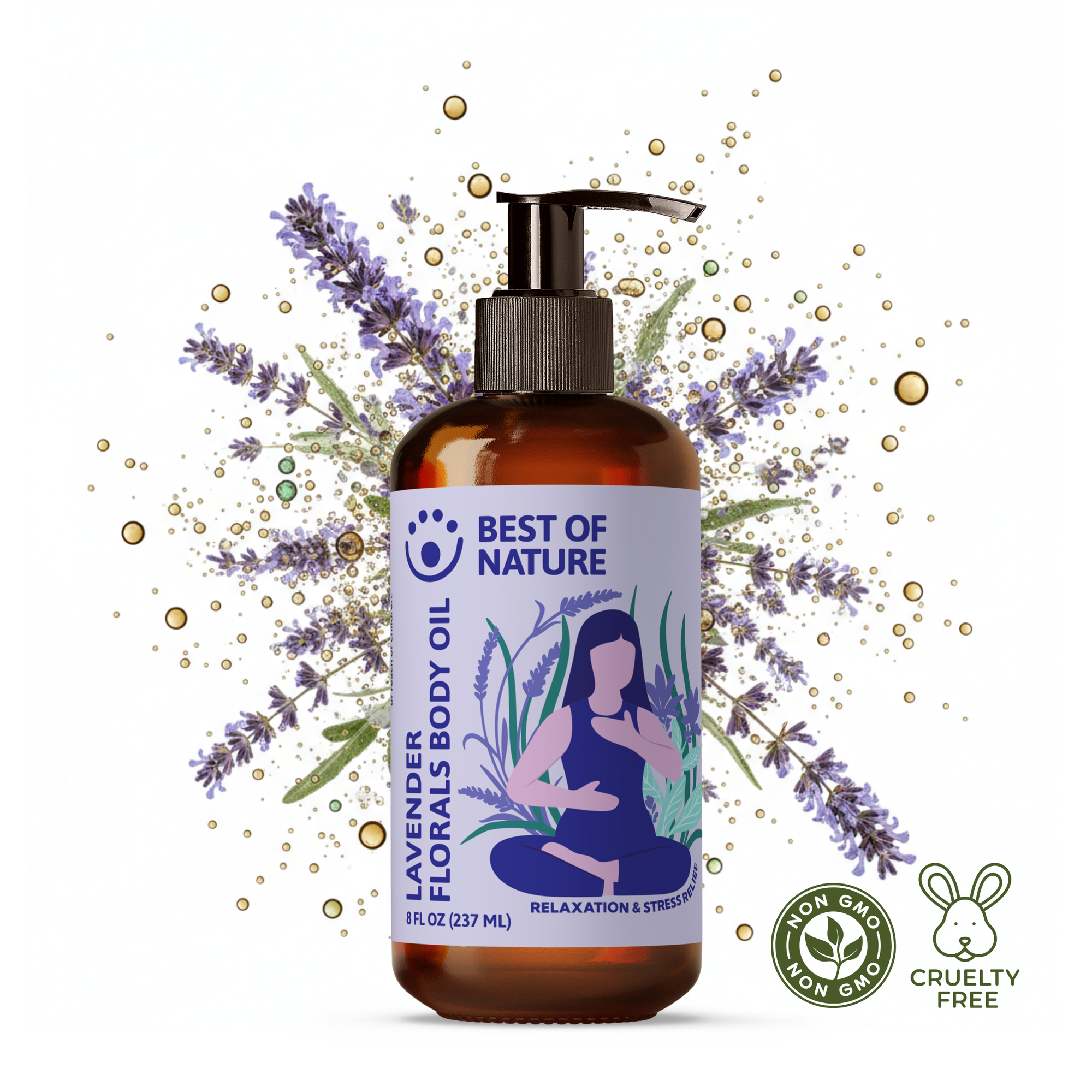 Bottle of 'Best of Nature' calming aromatique oil with flowers on a white background