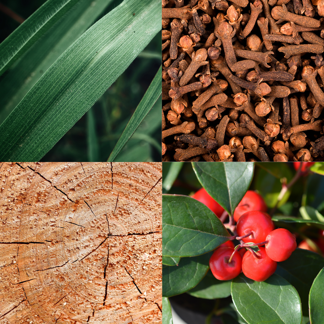 Aromatic blend of Cinnamon, Cedarwood, Wintergreen, Clove and Vetiver essential oils.